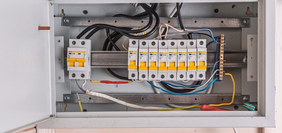 Open electrical panel with neatly arranged circuit breakers and colorful wires highlights organized wiring and safety in home power distribution.